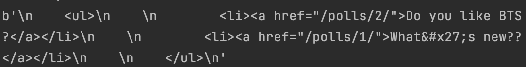 ‘/polls/’ 주소로 요청을하면, 다음과 같은 결과를 얻을 수 있다.