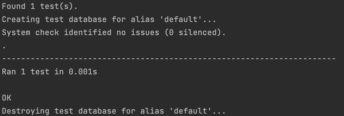 - 해당 메서드는 테스트 데이터베이스를 설치하지 않고, 기존 데이터베이스에 대해 실행되므로 이미 생성한 질문에 따라 출력이 조금씩 다를 수 있다.