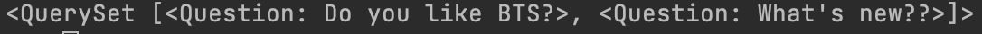 - Question.objects.filter(pub_date_lte=timezone.now())는 pub_date가 timezone.now보다 작거나 같은 질문이 포함된 쿼리 세트를 반환한다.