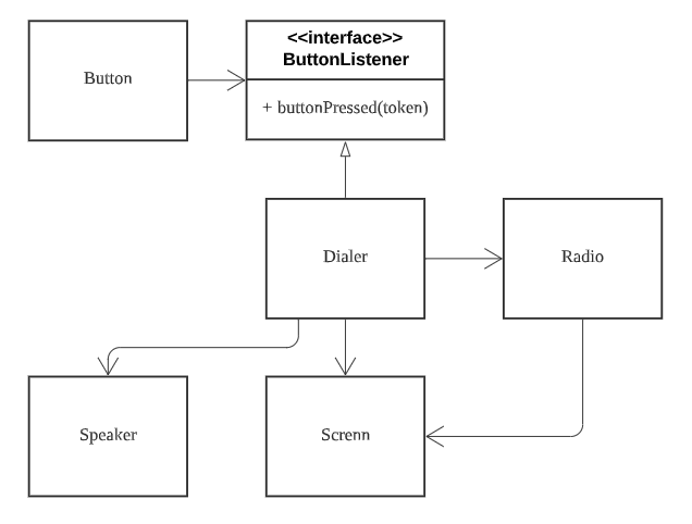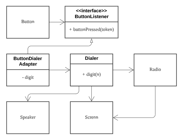 위 구조도 문제가 있다. Dialer가 Button을 알고 있다는 것이다. Dialer와 Button은 관계가 없으므로 Dialer 클래스에 buttonPressed 메서드가 있을 필요는 없다. 어댑터를 사용하여 해당 문제를 해결하자. 더불어 식별자 토큰 사용이라는 어설픈 아이디어도 없앨 수 있다.