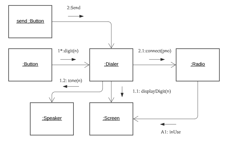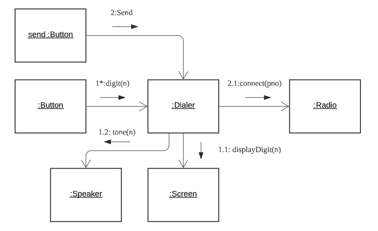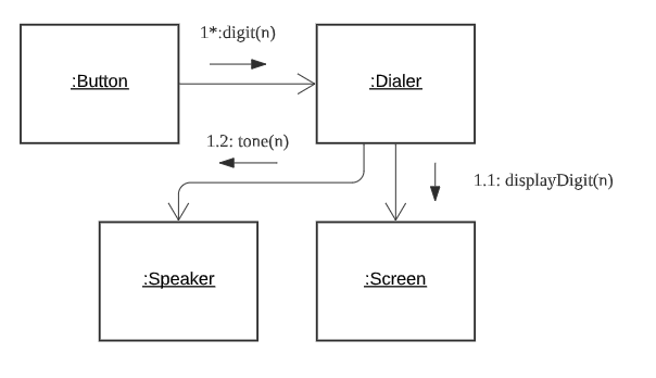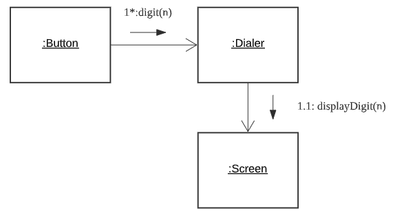 버튼이 눌릴 때마다 이를 감지해서 다이얼 돌리는 일을 제어하는 객체에 메시지를 보내는 것을 상상할 수 있다. 버튼 객체와 다이얼러 객체를 그려 버튼이 다이얼러에 번호 메시지를 여러 개 보내는 것을 그린다. *는 여러 개를 의미한다.