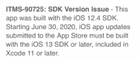 기존에 사용중인 Xcode 버전은 10 이었고, 해당 Xcode의 iOS SDK는 12 버전이었습니다. 그런데 아래와 같은 메일을 받았고, 앞으로는 iOS 13 SDK 이상 버전을 사용해야만 앱을 업데이트할 수 있는 상황이되어 Xcode 버전을 변경했습니다.